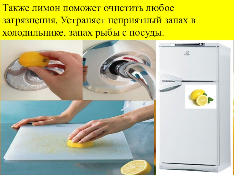 Слайд 9Также лимон поможет очистить любое загрязнения. Устраняет неприятный запах в холодильнике,