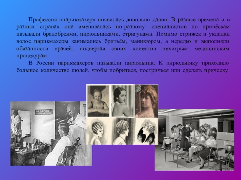 Слайд 3 Профессия «парикмахер» появилась довольно давно. В разные времена и в разных