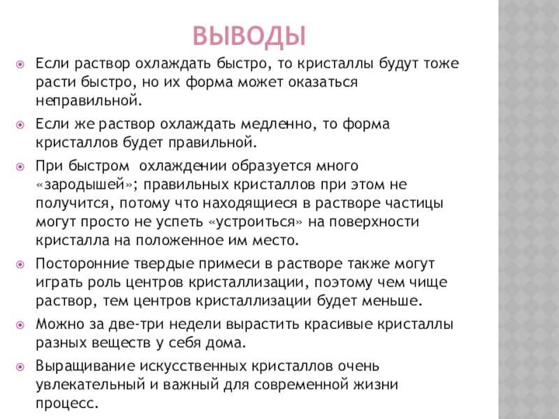 Если раствор охлаждать быстро, то кристаллы будут тоже расти быстро, но