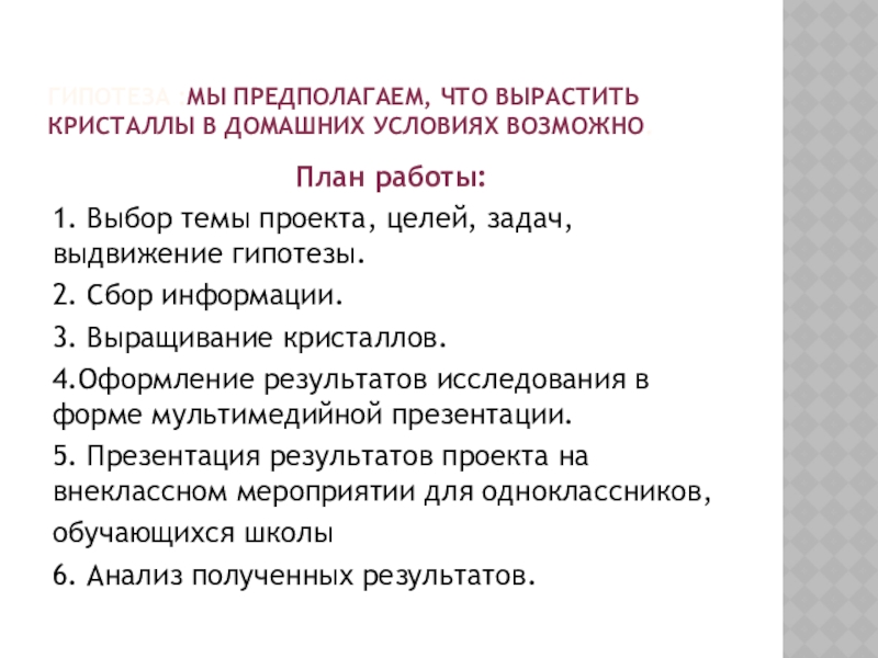 ГИПОТЕЗА :МЫ ПРЕДПОЛАГАЕМ, ЧТО ВЫРАСТИТЬ КРИСТАЛЛЫ В ДОМАШНИХ УСЛОВИЯХ ВОЗМОЖНО.