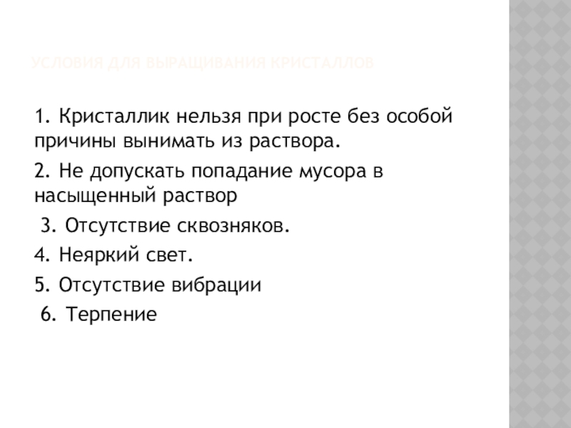 Слайд 12УСЛОВИЯ ДЛЯ ВЫРАЩИВАНИЯ КРИСТАЛЛОВ
