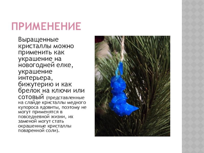 украшение интерьера, бижутерию и как брелок на ключи или сотовый (представленные на слайде кристаллы медного купороса ядовиты, поэтому не могут применятся в повседневной жизни, их заменой могут стать окрашенные кристаллы поваренной соли).