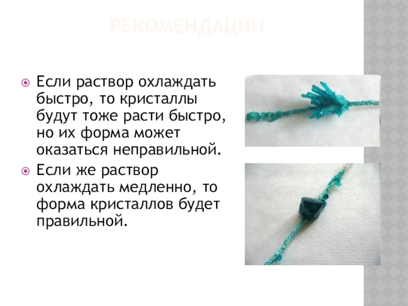 Если же раствор охлаждать медленно, то форма кристаллов будет правильной.