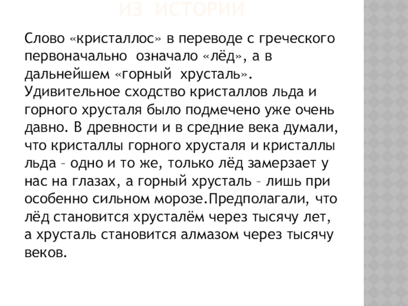 в дальнейшем «горный хрусталь». Удивительное сходство кристаллов льда и горного хрусталя было подмечено уже очень давно. В древности и в средние века думали, что кристаллы горного хрусталя и кристаллы льда – одно и то же, только лёд замерзает у нас на глазах, а горный хрусталь – лишь при особенно сильном морозе.Предполагали, что лёд становится хрусталём через тысячу лет, а хрусталь становится алмазом через тысячу веков.