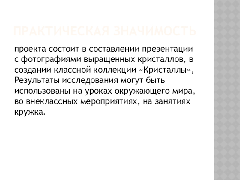 создании классной коллекции «Кристаллы», Результаты исследования могут быть использованы на уроках окружающего мира, во внеклассных мероприятиях, на занятиях кружка.