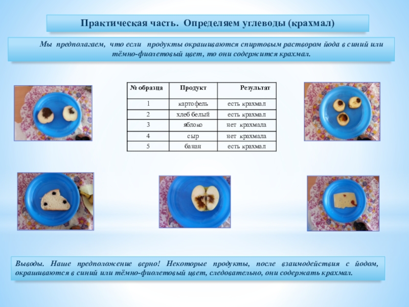 Выводы. Наше предположение верно! Некоторые продукты, после взаимодействия с йодом, окрашиваются в синий или тёмно-фиолетовый цвет, следовательно, они содержать крахмал.