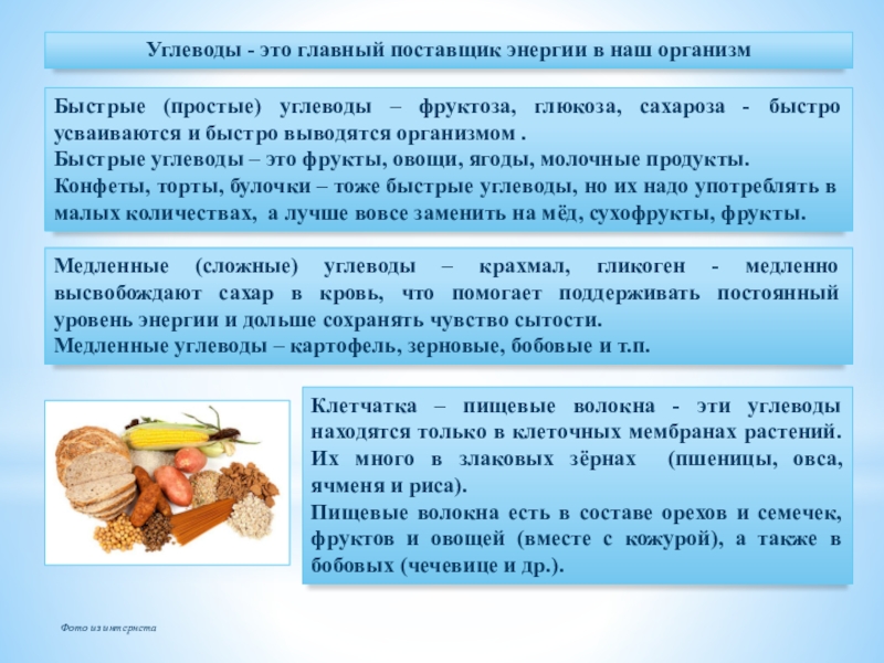 Медленные (сложные) углеводы – крахмал, гликоген - медленно высвобождают сахар в кровь, что помогает поддерживать постоянный уровень энергии и дольше сохранять чувство сытости.