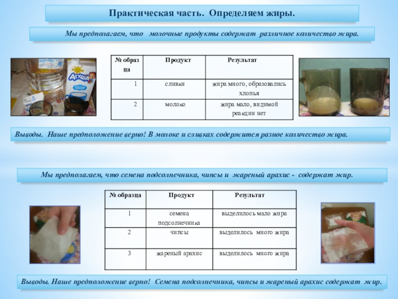 Выводы. Наше предположение верно! В молоке и сливках содержится разное количество жира.