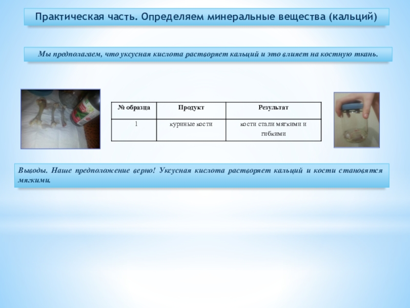 Выводы. Наше предположение верно! Уксусная кислота растворяет кальций и кости становятся мягкими.
