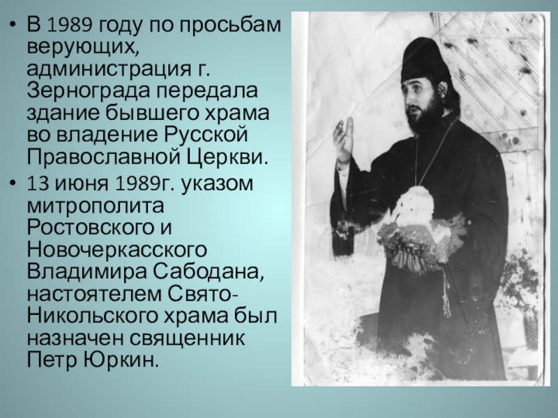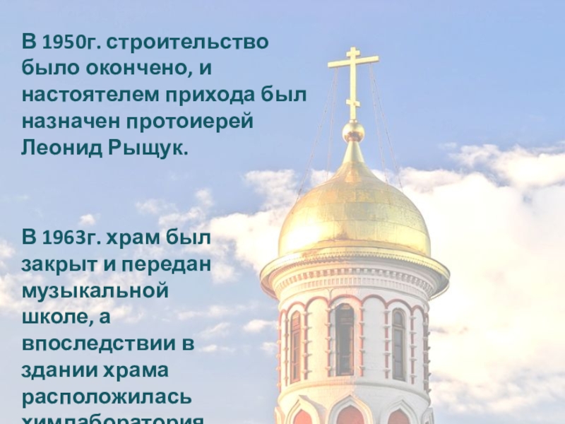 В 1950г. строительство было окончено, и настоятелем прихода был назначен протоиерей Леонид Рыщук.