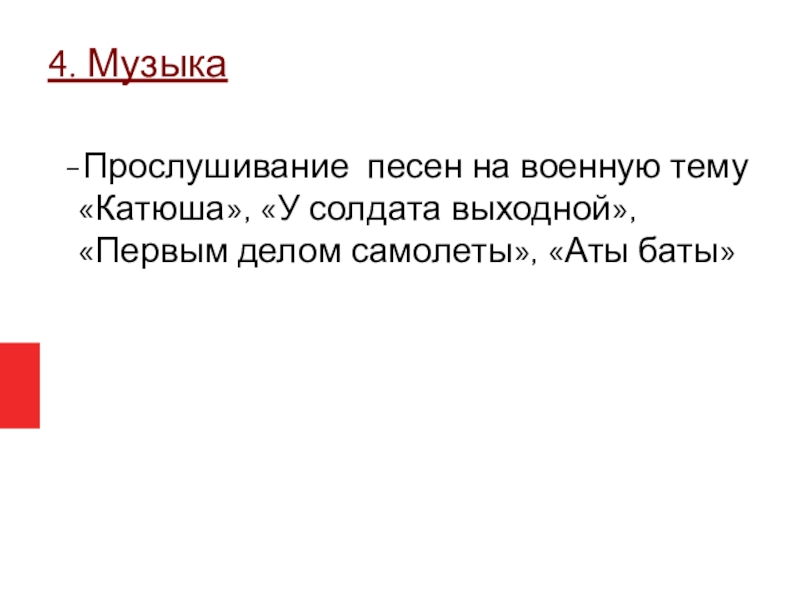 4. Музыка -Прослушивание песен на военную тему «Катюша», «У солдата выходной», «Первым делом самолеты», «Аты баты»