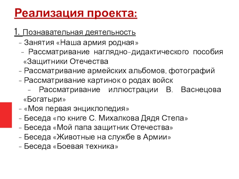 Реализация проекта:1. Познавательная деятельность - Занятия «Наша армия родная» - Рассматривание наглядно-дидактического пособия «Защитники Отечества - Рассматривание