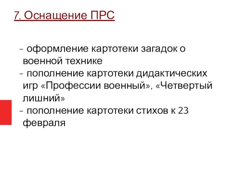 7. Оснащение ПРС - оформление картотеки загадок о военной технике - пополнение картотеки дидактических игр «Профессии военный»,