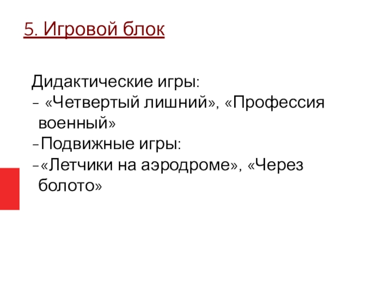 5. Игровой блок Дидактические игры: - «Четвертый лишний», «Профессия военный» -Подвижные игры: -«Летчики на аэродроме», «Через болото»