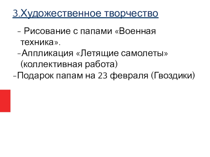 3.Художественное творчество - Рисование с папами «Военная техника». -Аппликация «Летящие самолеты» (коллективная работа)-Подарок папам на 23 февраля