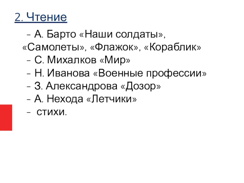2. Чтение   - А. Барто «Наши солдаты», «Самолеты», «Флажок», «Кораблик»   - С. Михалков