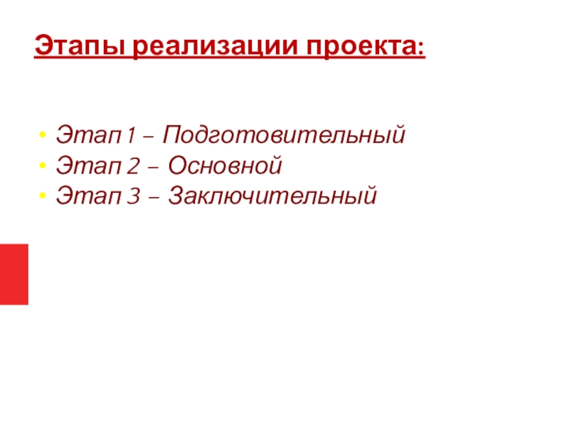 Этапы реализации проекта: Этап 1 – ПодготовительныйЭтап 2 – Основной Этап 3 – Заключительный
