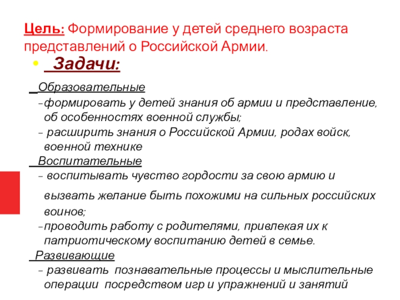Цель: Формирование у детей среднего возраста представлений о Российской Армии.  Задачи:  Образовательные  -формировать у