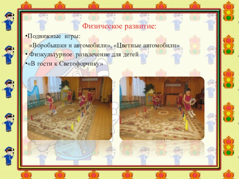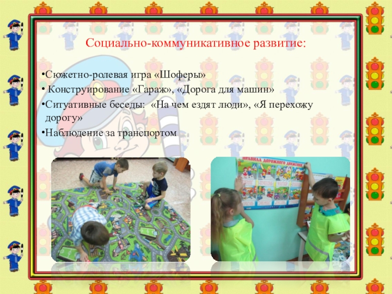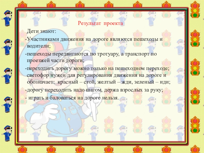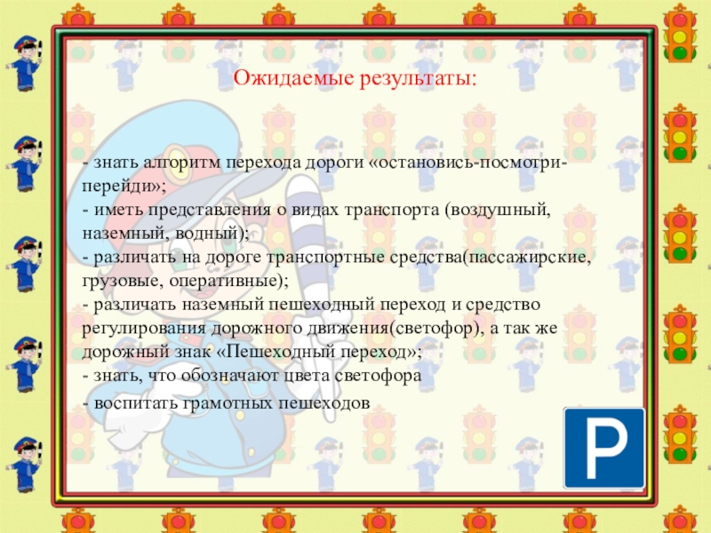 - различать наземный пешеходный переход и средство регулирования дорожного движения(светофор), а так же дорожный знак «Пешеходный переход»;