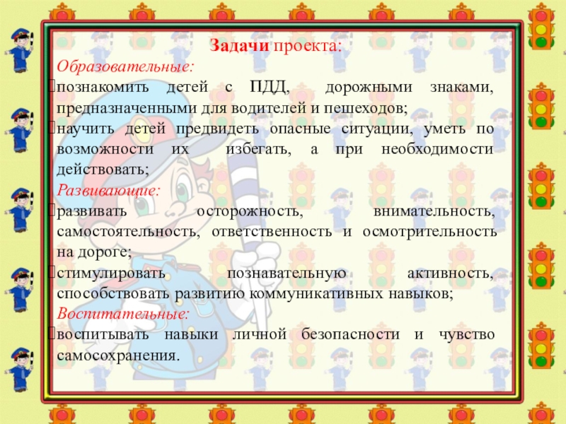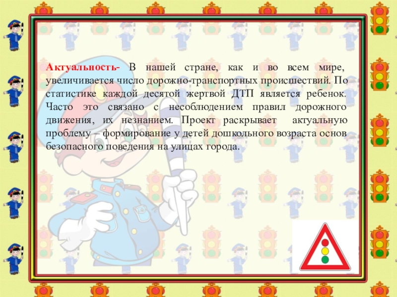 дорожно-транспортных происшествий. По статистике каждой десятой жертвой ДТП является ребенок. Часто это связано с несоблюдением правил дорожного движения, их незнанием. Проект раскрывает актуальную проблему – формирование у детей дошкольного возраста основ безопасного поведения на улицах города.
