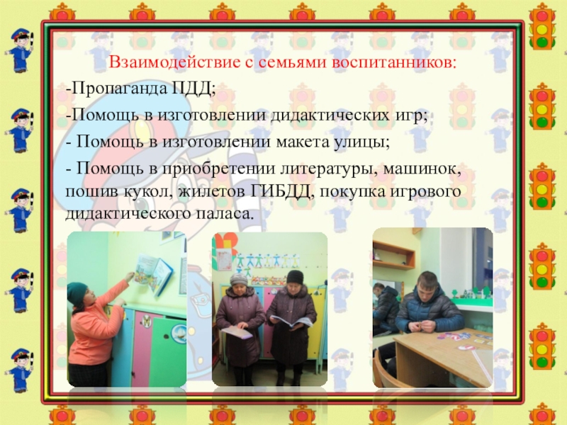 - Помощь в приобретении литературы, машинок, пошив кукол, жилетов ГИБДД, покупка игрового дидактического паласа.