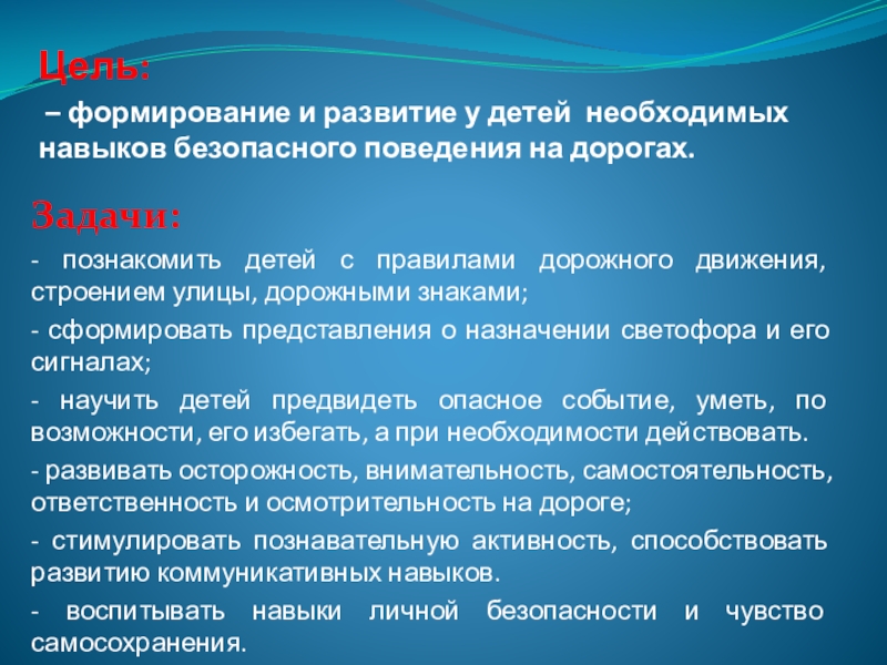 - познакомить детей с правилами дорожного движения, строением улицы, дорожными знаками;