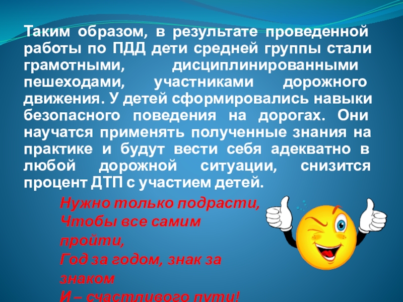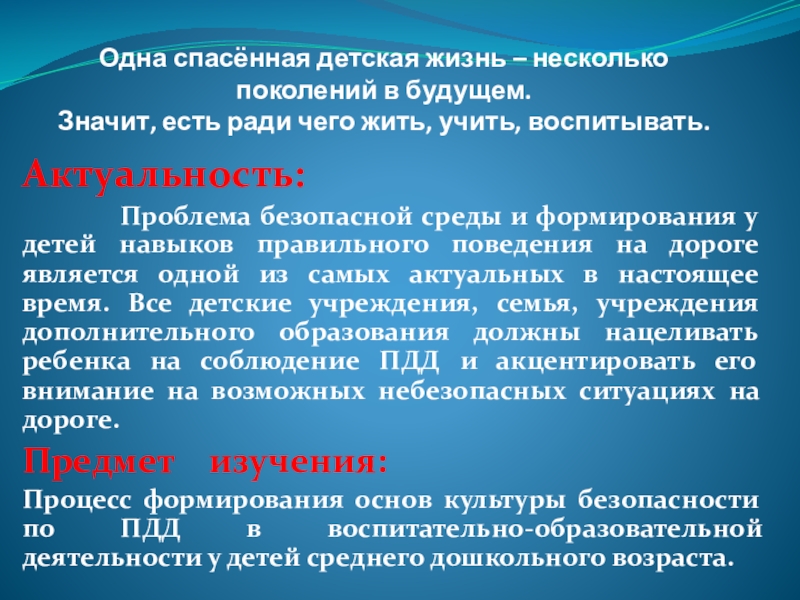 Проблема безопасной среды и формирования у детей навыков правильного поведения на дороге является одной из самых актуальных в настоящее время. Все детские учреждения, семья, учреждения дополнительного образования должны нацеливать ребенка на соблюдение ПДД и акцентировать его внимание на возможных небезопасных ситуациях на дороге.