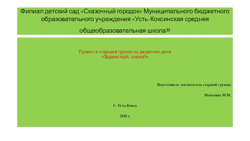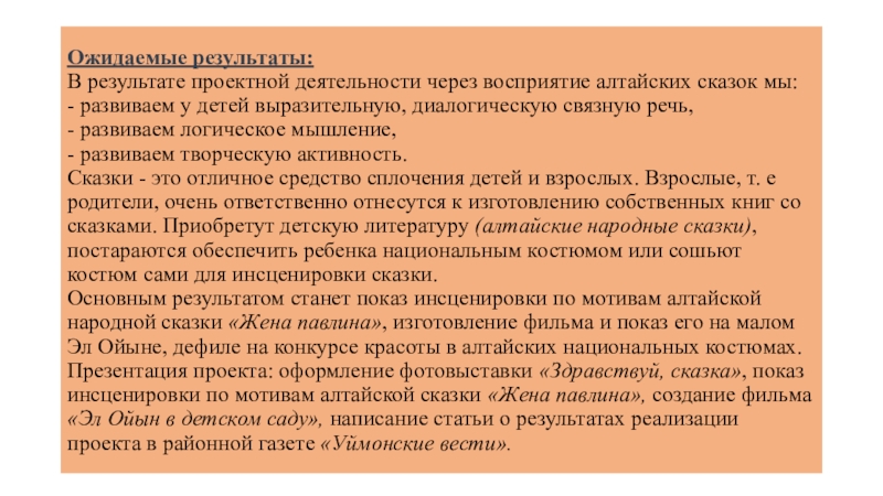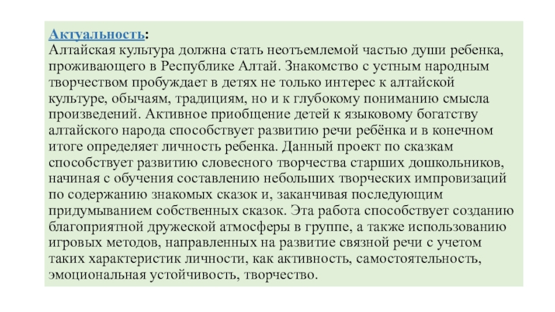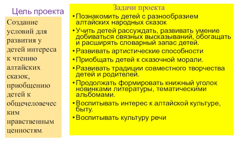 Создание условий для развития у детей интереса к чтению алтайских сказок, приобщению детей к общечеловеческим нравственным ценностям.