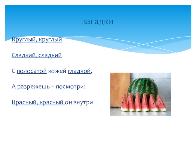 загадкиКруглый, круглыйСладкий, сладкийС полосатой кожей гладкой, А разрежешь – посмотри:Красный, красный он внутри