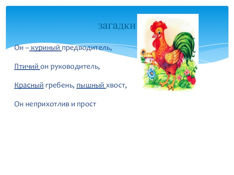 загадкиОн – куриный предводитель,Птичий он руководитель,Красный гребень, пышный хвост, Он неприхотлив и прост