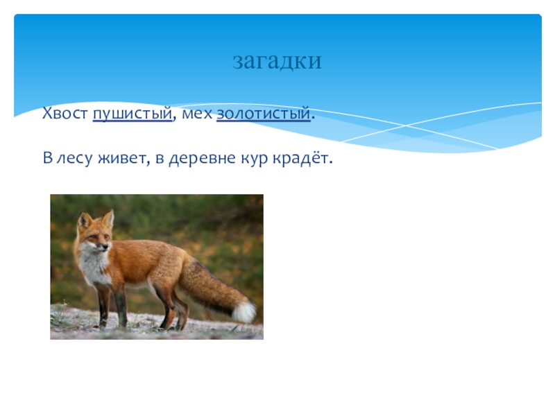 загадкиХвост пушистый, мех золотистый.В лесу живет, в деревне кур крадёт.