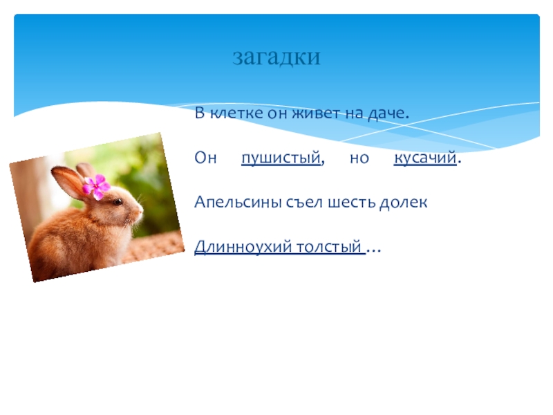 загадкиВ клетке он живет на даче.Он пушистый, но кусачий. Апельсины съел шесть долекДлинноухий толстый …