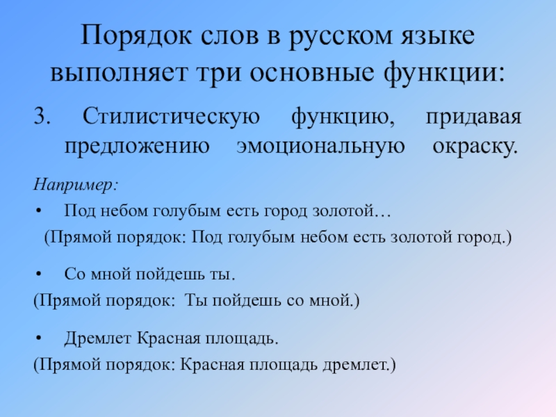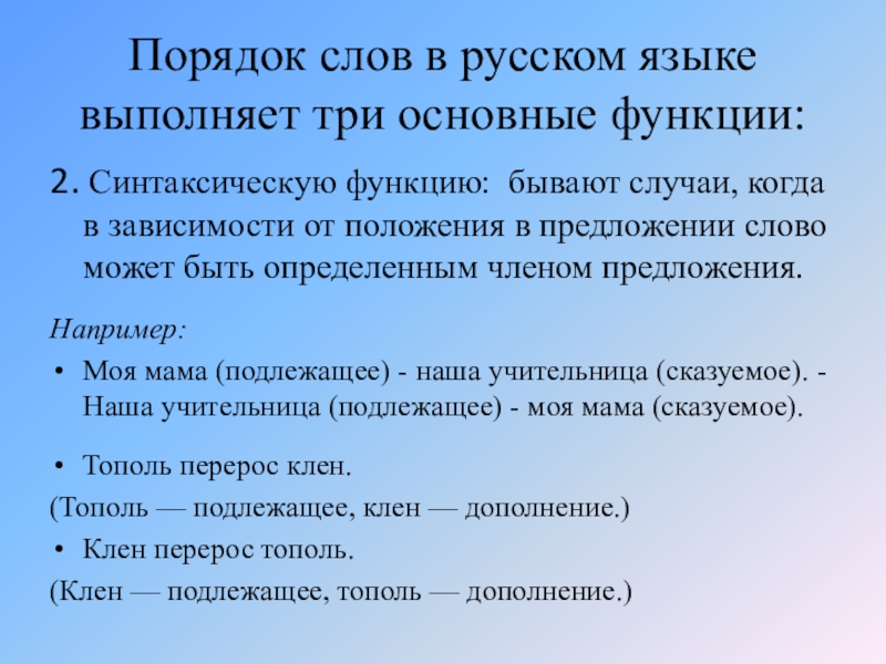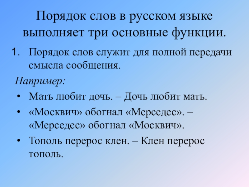 Слайд 11Порядок слов в русском языке выполняет три основные функции: