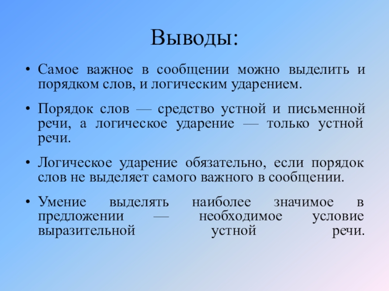 Самое важное в сообщении можно выделить и порядком слов, и логическим
