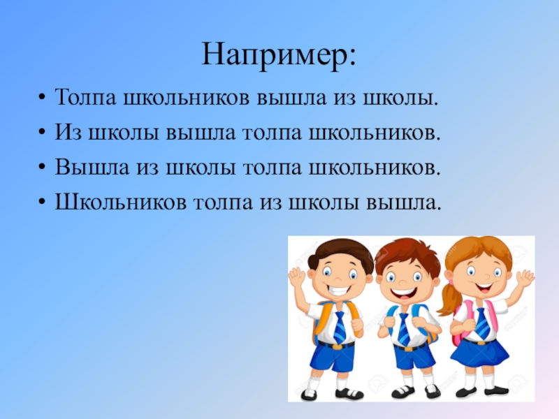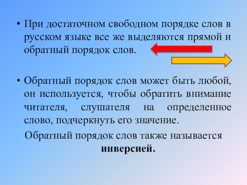 В русском языке порядок слов свободный. Это означает, что за тем или иным членом предложения не существует строго закрепленного места.