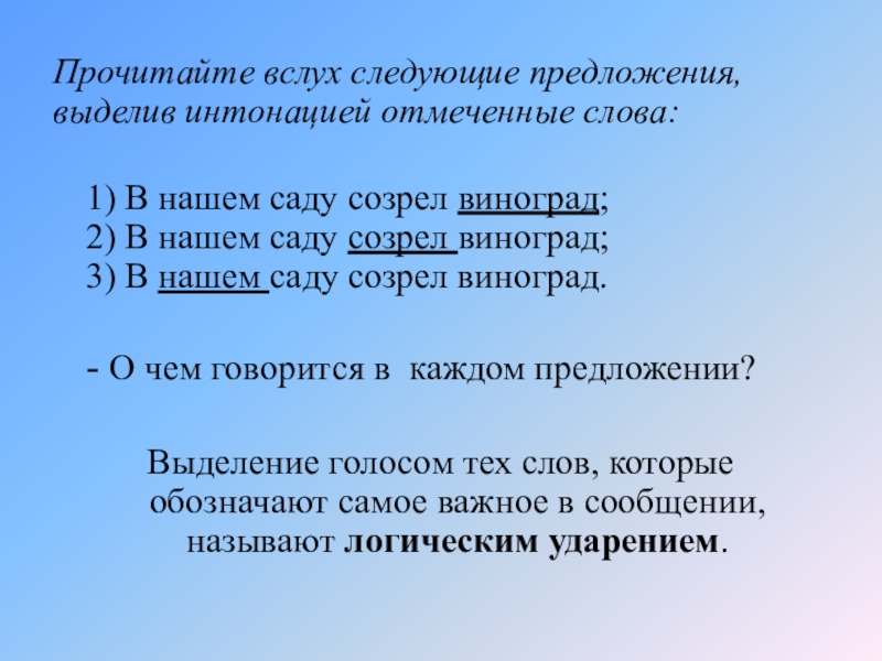 Выделение голосом тех слов, которые обозначают самое важное в сообщении, называют логическим ударением.