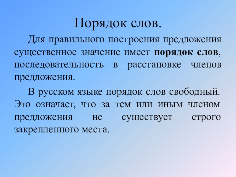 Для правильного построения предложения существенное значение имеет порядок слов, последовательность