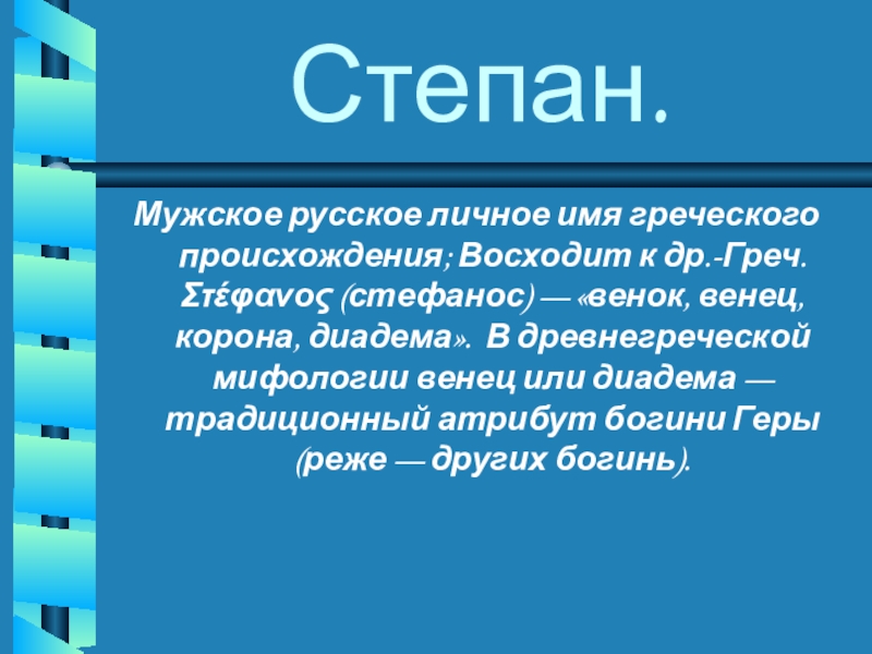 Мужское русское личное имя греческого происхождения; Восходит к др.-Греч. Στέφανος (стефанос)