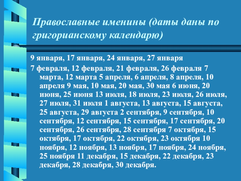 Слайд 13Православные именины (даты даны по григорианскому календарю)