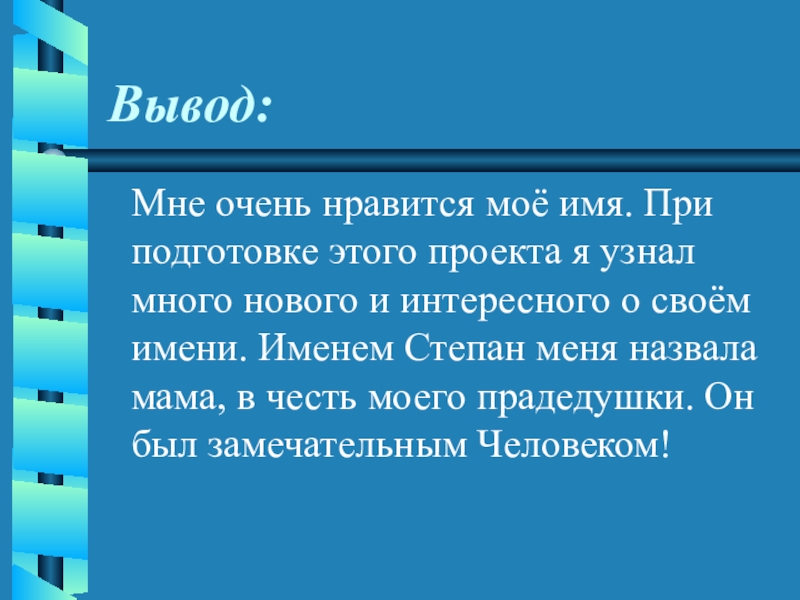 я узнал много нового и интересного о своём имени. Именем Степан меня назвала мама, в честь моего прадедушки. Он был замечательным Человеком!