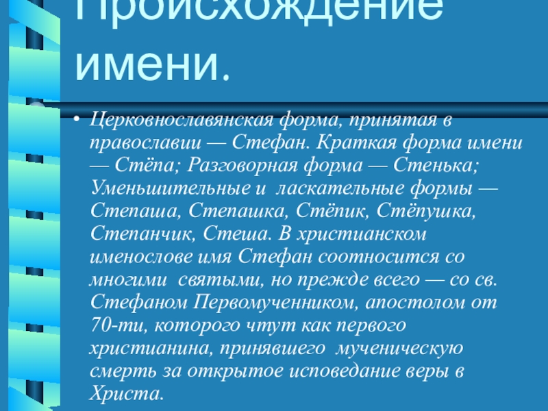 — Стёпа; Разговорная форма — Стенька; Уменьшительные и ласкательные формы — Степаша, Степашка, Стёпик, Стёпушка, Степанчик, Стеша. В христианском именослове имя Стефан соотносится со многими святыми, но прежде всего — со св. Стефаном Первомученником, апостолом от 70-ти, которого чтут как первого христианина, принявшего мученическую смерть за открытое исповедание веры в Христа.