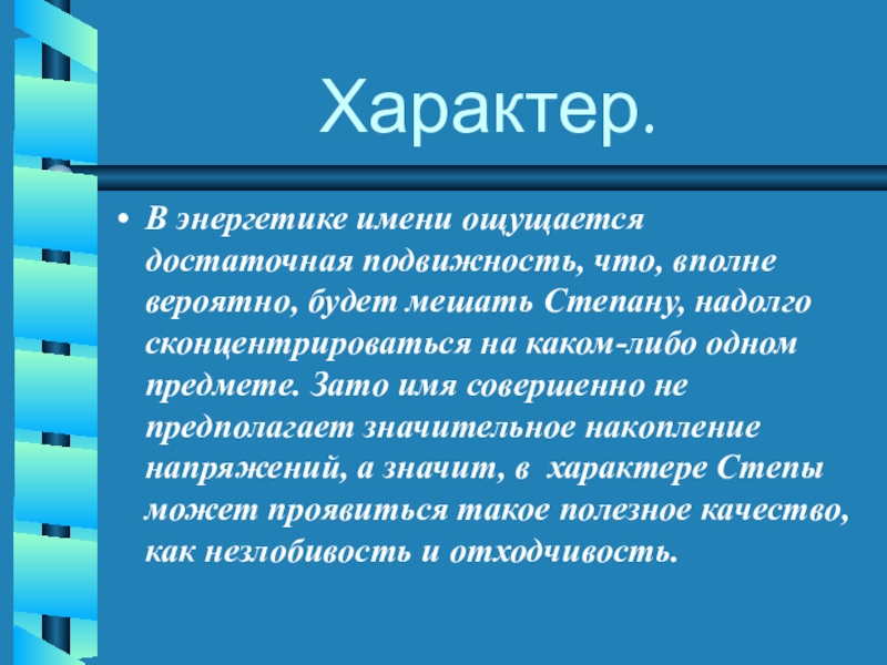 Степану, надолго сконцентрироваться на каком-либо одном предмете. Зато имя совершенно не предполагает значительное накопление напряжений, а значит, в характере Степы может проявиться такое полезное качество, как незлобивость и отходчивость.