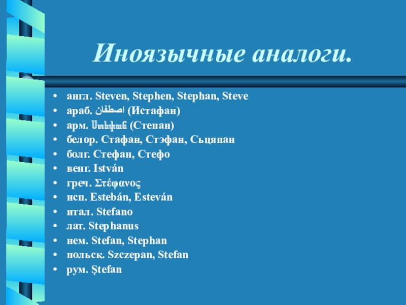 Церковнославянская форма, принятая в православии — Стефан. Краткая форма имени