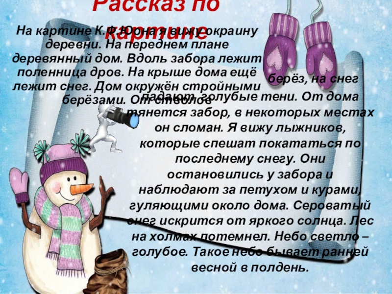 берёз, на снег падают голубые тени. От дома тянется забор, в некоторых местах он сломан. Я вижу лыжников, которые спешат покататься по последнему снегу. Они остановились у забора и наблюдают за петухом и курами, гуляющими около дома. Сероватый снег искрится от яркого солнца. Лес на холмах потемнел. Небо светло – голубое. Такое небо бывает ранней весной в полдень.