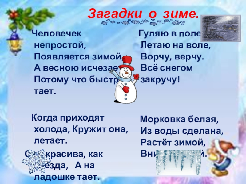 Морковка белая, Из воды сделана, Растёт зимой, Вниз головой.