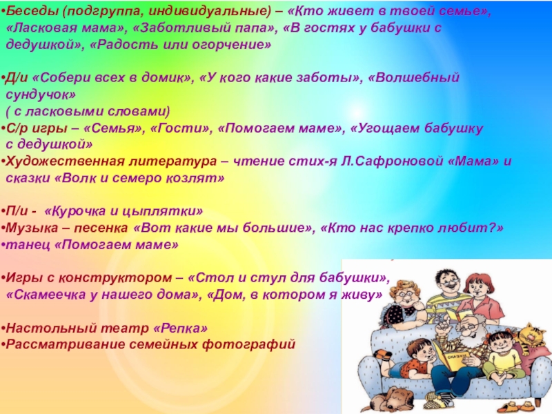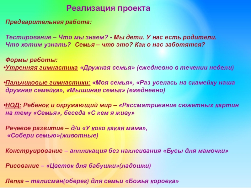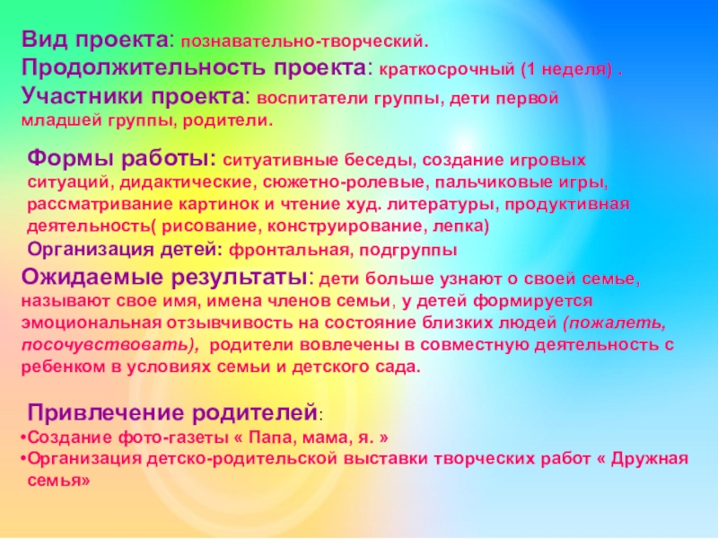 Ожидаемые результаты: дети больше узнают о своей семье, называют свое имя, имена членов семьи, у детей формируется эмоциональная отзывчивость на состояние близких людей (пожалеть, посочувствовать), родители вовлечены в совместную деятельность с ребенком в условиях семьи и детского сада.