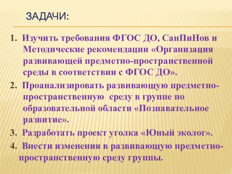 План работы: определение темы, цели и задач, отбор материала, литературы; изучение литературы, требований ФГОС ДО, СанПиНов и методических рекомендаций «Организация предметно-пространственной среды в соответствии с ФГОС ДО».