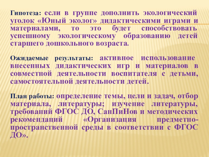 Слайд 4Гипотеза: если в группе дополнить экологический уголок «Юный эколог» дидактическими играми