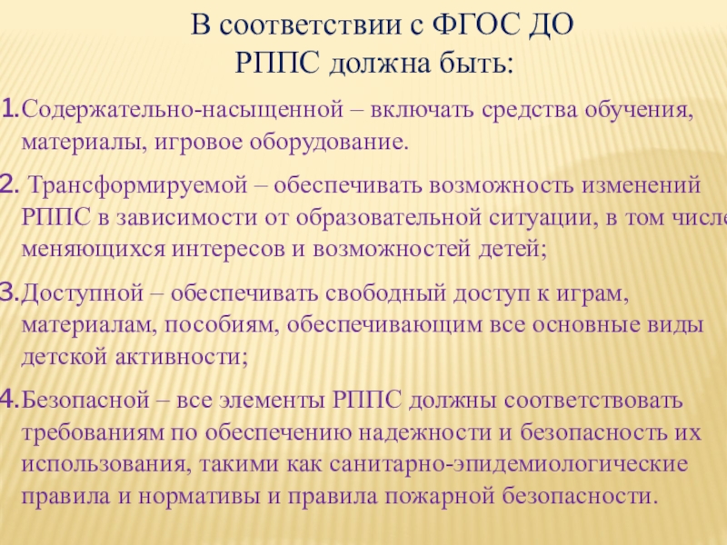 Безопасной – все элементы РППС должны соответствовать требованиям по обеспечению надежности и безопасность их использования, такими как санитарно-эпидемиологические правила и нормативы и правила пожарной безопасности.