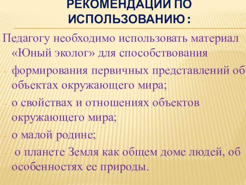 Педагогу необходимо использовать материал «Юный эколог» для способствования